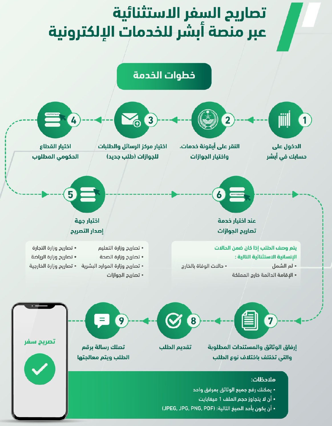 جدير بالذكر أن المديرية العامة للجوازات قد طالبت المستفيد، بضرورة رفع كافة المستندات في مرفق واحد فقط ، على أن لا يتجاوز حجم الملف واحد ميجابايت فقط، و أن تكون صيغة الموفق واحدة من الصيغ التالية: (JPEG-JPG-PNG-PDF).