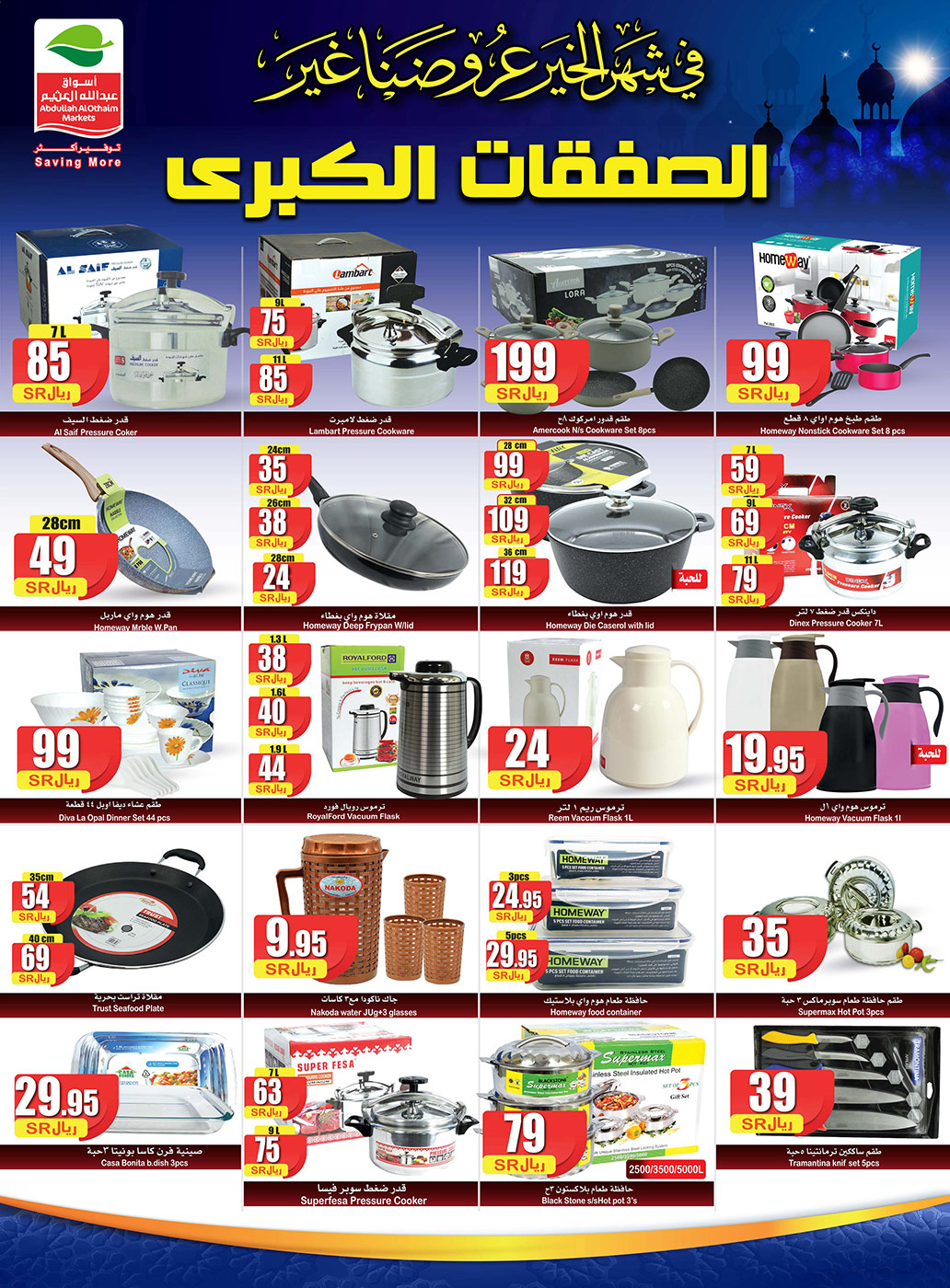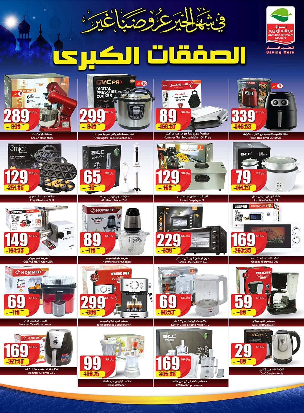أطلقت مجموعة محلات العثيم للبيع بالتجزئة في المملكة العربية السعودية عدد ضخم من العروض والخصومات التي تستمر من يوم 24 مارس وحتى 31 مارس القادم، وتتضمن مجموعة ضخمة من الأدوات المنزلية والكهربائية والشاشات والأجهزة الإلكترونية التي تصل نسبة الخصم بها إلى 50% في سابقة هي الأولى من نوعها في عالم التخفيضات، وذلك تحت شعار الصفقات الكبرى من محلات العثيم في المملكة العربية السعودية.