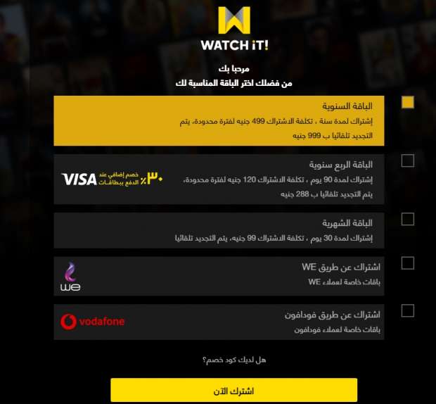 – الباقة السنوية: اشتراك لمدة سنة بـ499 جنيها، ويتم التجديد تلقائيًا بـ999 جنيها.