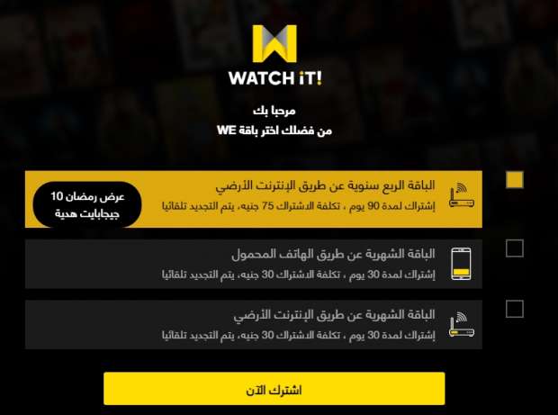 وتمنحك المصرية للاتصالات عرضًا للاشتراك في المنصة لمدة 3 أشهر بسعر 75 جنيهًا، إضافة إلى 10 جيجابايتس كل شهر، إذ يمكنك الاشتراك في العرض برقم الإنترنت الأرضي شريطة أن يكون الخط مفعّل، ويتم خصم الاشتراك في الخدمة من رصيدك أو إضافة قيمة الاشتراك لفاتورتك القادمة كل 90 يوم، وتكون الجيجابايتس الهدية مخصصة لاستخدام WATCH iT فقط.