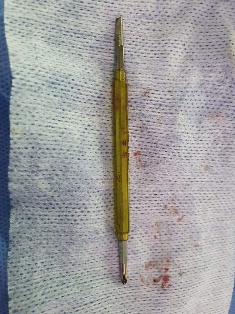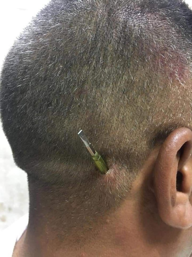 وغرزت السيدة المفك برأسه وأحدثت جرحًا غائرًا، في حين جرى نقل المجني عليه للمستشفى، وتم إنقاذ حياته واستخراج المفك من رأسه. وتمكنت الشرطة من ضبط المتهمة واتخاذ الإجراءات القانونية بحقها.