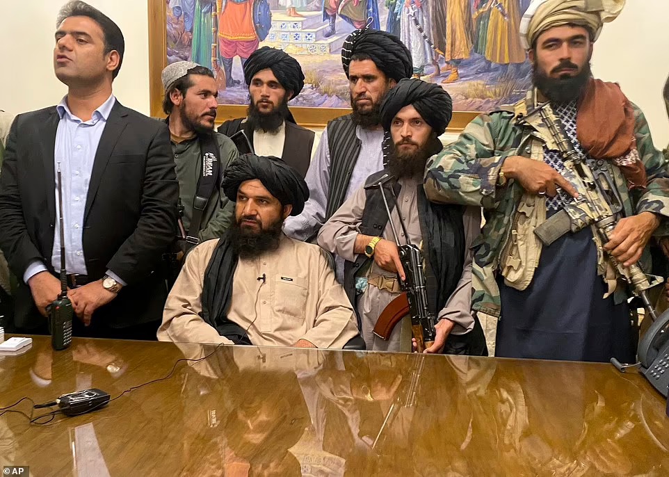 لقطات جديدة من داخل القصر الرئاسي الأفغاني.. شاهد: مقاتلو “طالبان” بالرشاشات وزعيم الحركة على مكتب الرئيس
