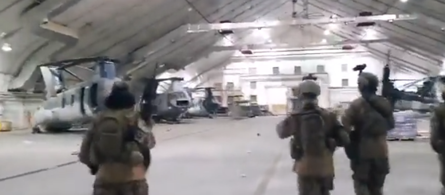 وأظهر مقطع فيديو متداول على موقع “تويتر” دخول عناصر حركة “طالبان” وهم يرتدون زي القوات الخاصة الأمريكية “الكوماندوز” إلى هنجر طائرات أمريكية.