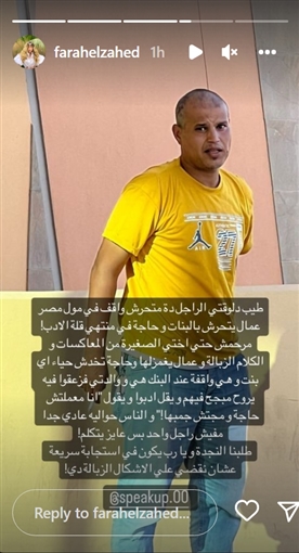 ونشرت فرح الزاهد عبر خاصية “ستوري” في حسابها على إنستجرام صورة للشخص الذي تتهمه بالتحرش، وكتبت شارحة الواقعة : “طيب دلوقتي الراجل دة متحرش واقف في مول مصر عمال يتحرش بالبنات وحاجة في منتهى قلة الأدب! مرحمش حتي أختي الصغيرة من المعاكسات والكلام الزبالة وعمال يغمزلها وحاجة تخدش حياء أي بنت”.