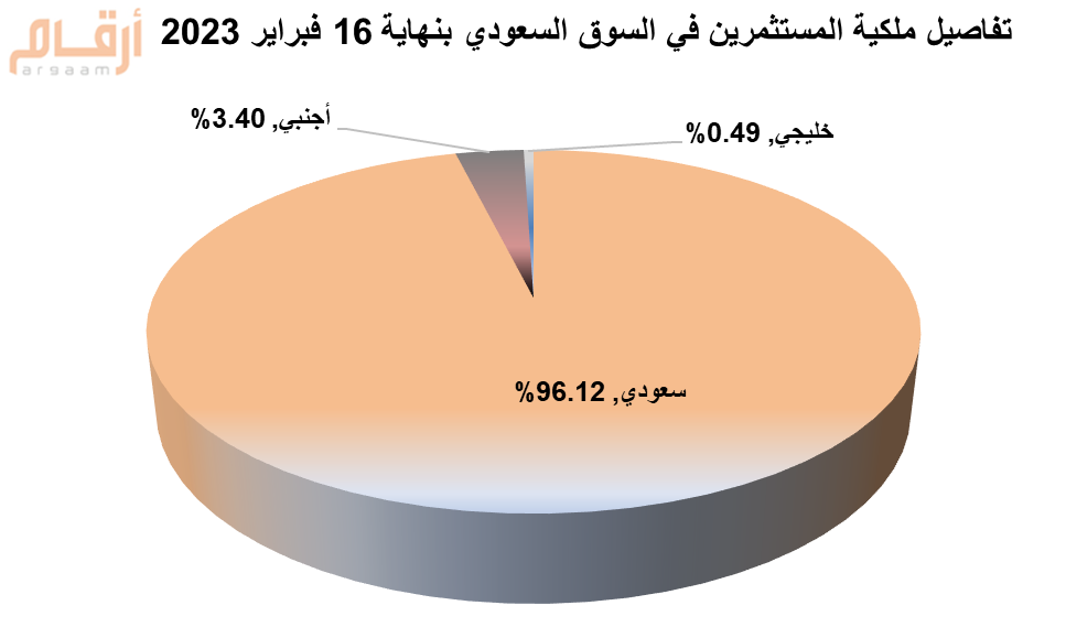أما قيمة ملكية “المستثمر الأجنبي” فقد شكّلت ما نسبته 3.4 % من إجمالي القيمة السوقية للأسهم المدرجة كما في 16 فبراير 2023، كما يتضح أدناه:
