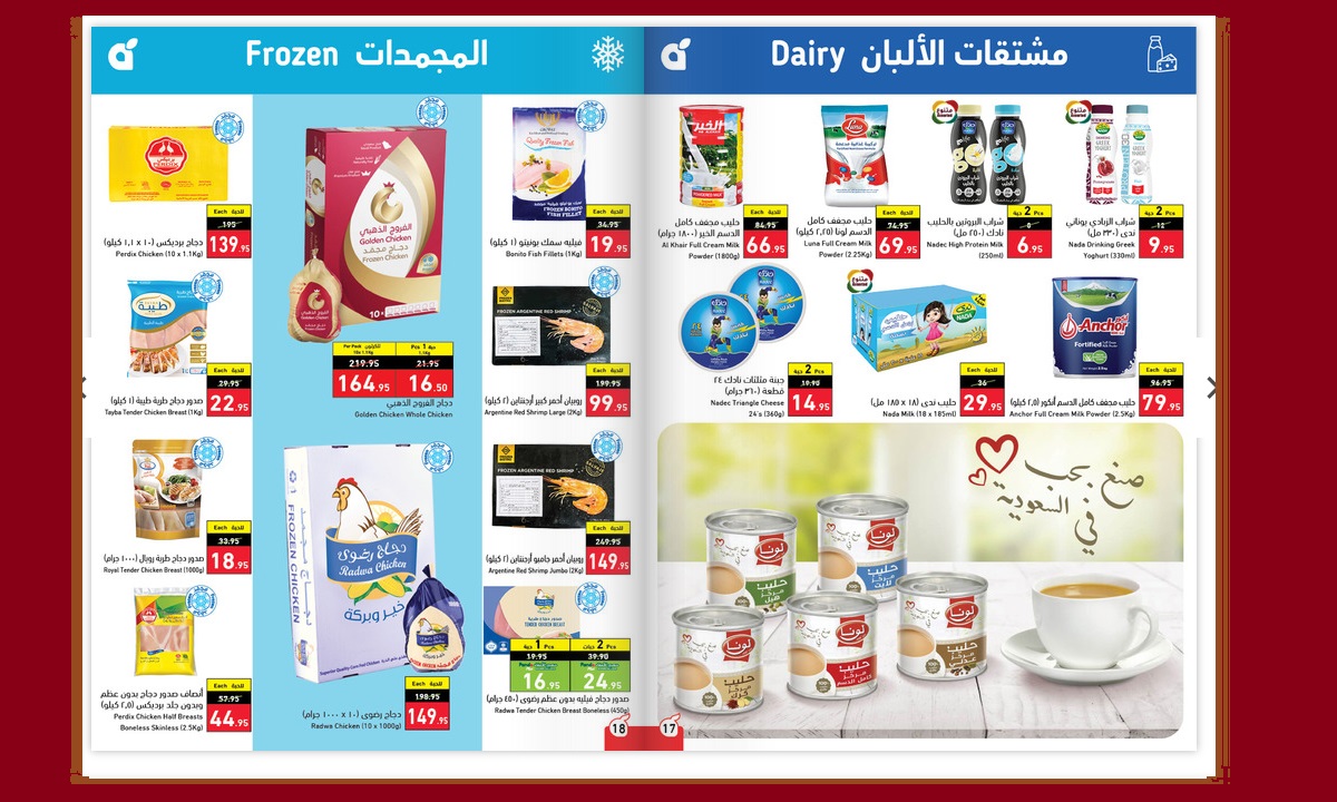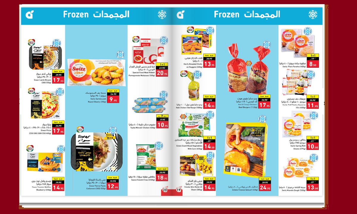 يشمل بروشور عروض بنده تخفيضات على الأغذية المبردة والمجمدة كالبرجر والناجتس والدواجن ومشتقاتها، فضلاً عن الخضراوات والمأكولات البحرية كالروبيات وفيليه السمك، بالإضافة إلى الفطائر الجاهزة وعجينة البيتزا والسمبوسك وغيرها من الأطعمة سريعة التحضير.