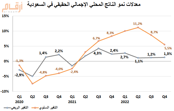 كشفت الهيئة العامة للإحصاء عن أن الناتج المحلي الإجمالي الحقيقي للسعودية ارتفع بنسبة 5.5% في الربع الرابع 2022 مقارنة بنفس الفترة من عام 2021.