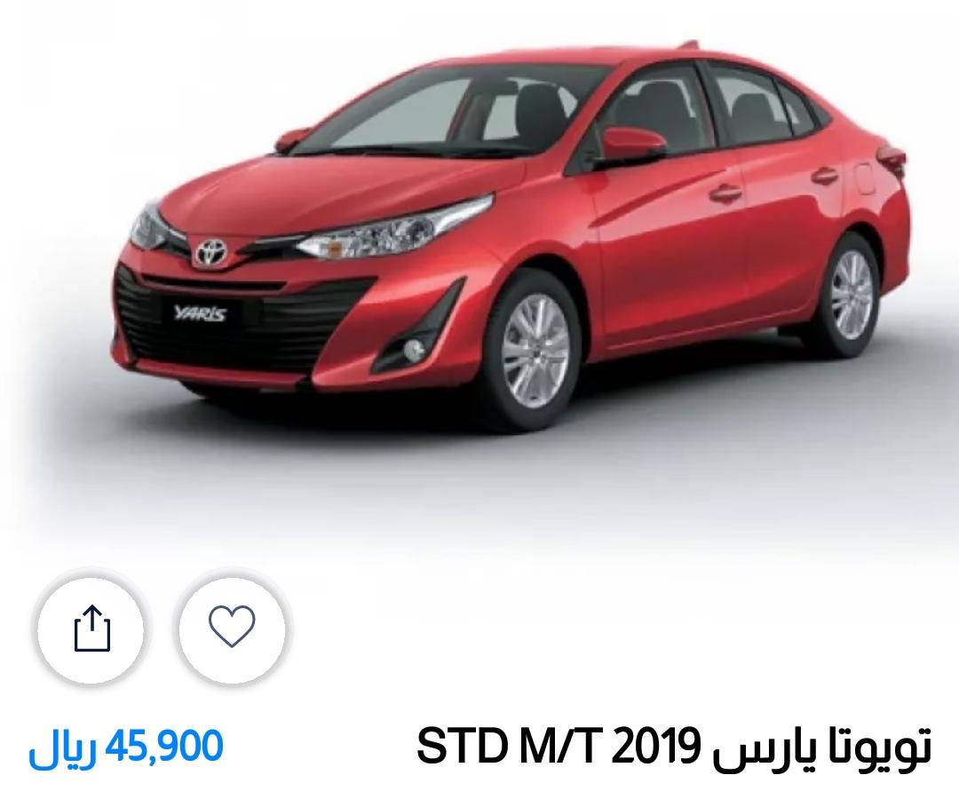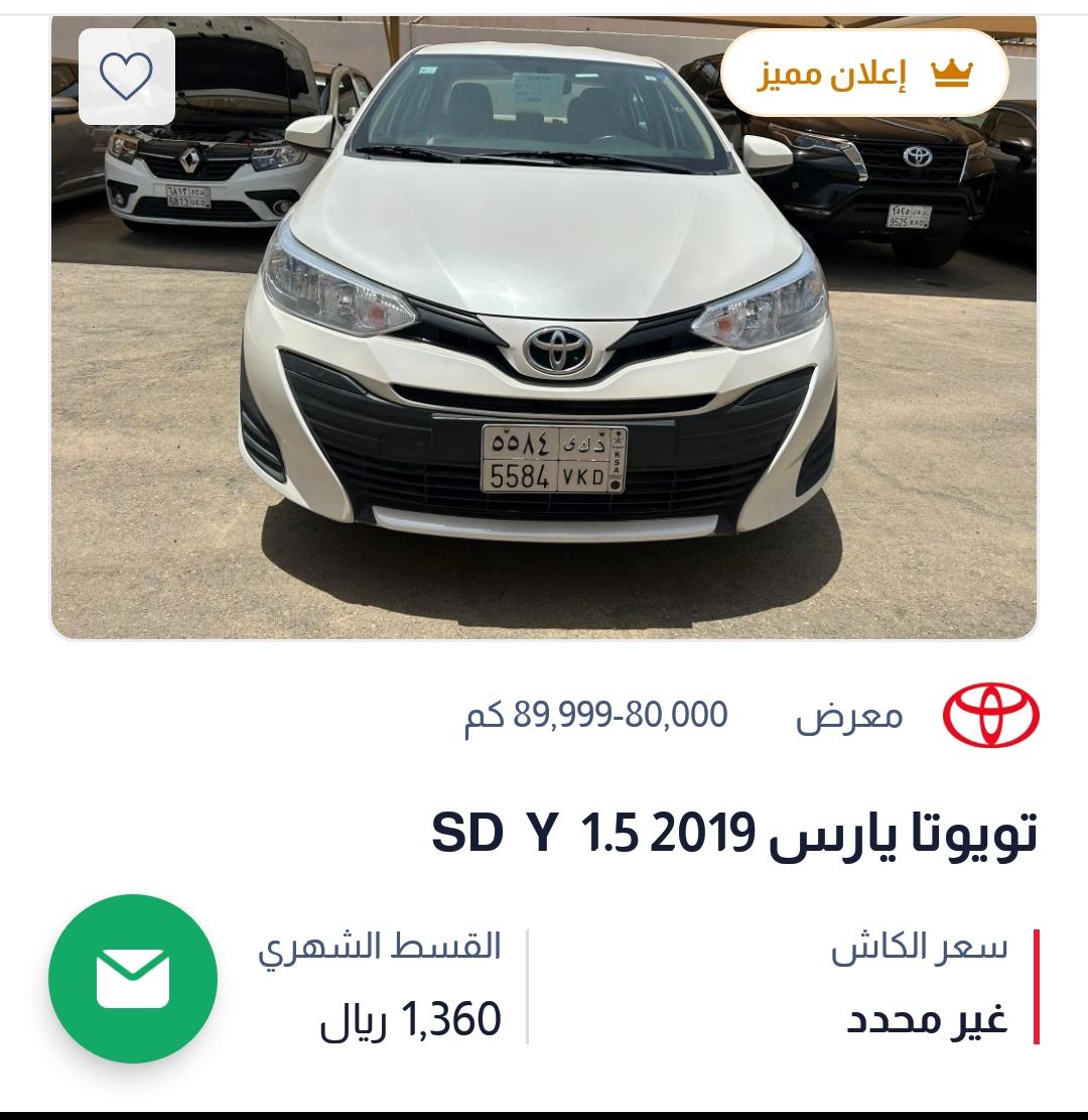 سيارة تويوتا يارس 2019 معروضة للبيع بالتقسيط مقابل دفع قسط شهري 1.360 ريال سعودي لمدة 54 شعر والدفعة الأخيرة للسيارة 9.953 ريال.