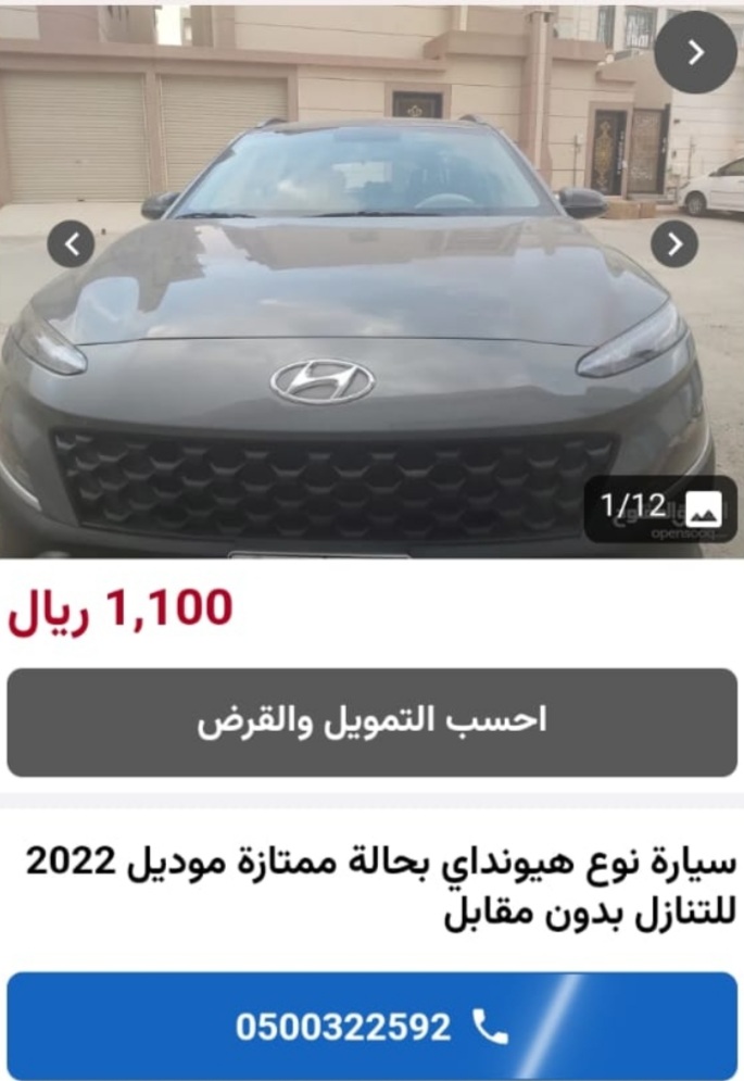 السيارة هيونداي كونا متاحة للتنازل بدون مقابل ويبلغ القسط الشهري 1100 ريال سعودي على البنك الأهلي.